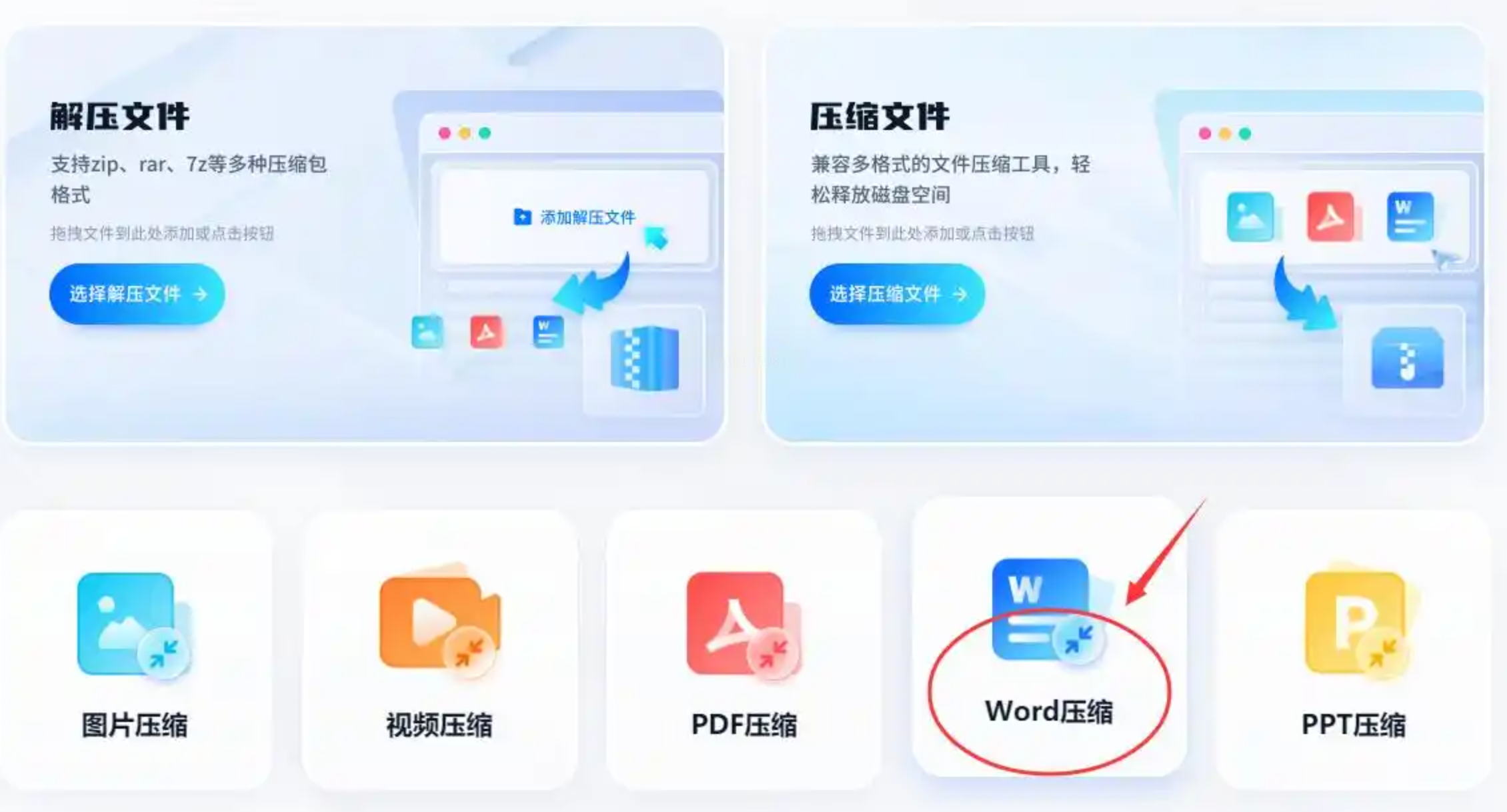 步骤一:打开软件后,在功能分类中找到【Word压缩】模块,该工具支持同时处理Word、PPT、PDF等多种格式文件,避免格式转换兼容性问题。
