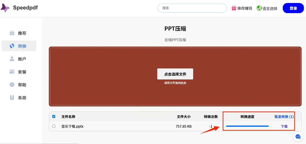 步骤一:打开Speedpdf官网,在工具列表中找到“PPT压缩”功能,点击进入后选择“选择文件”或直接拖拽PPT文件。支持同时上传多个文件,但单个文件建议不超过50MB。