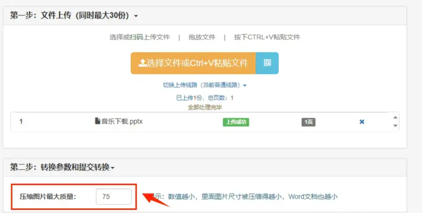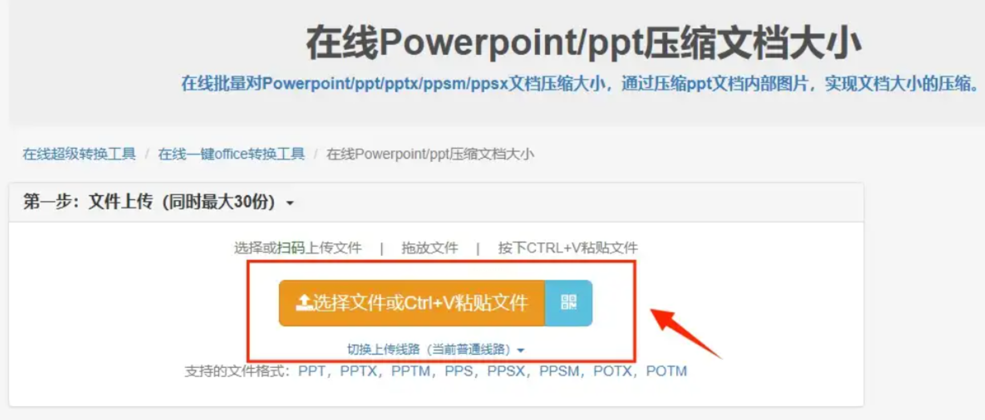 步骤一:打开WDKU平台的PPT压缩页面,页面提供三种上传方式——直接点击“选择文件”从本地调取,或用Ctrl+V快捷键粘贴文件路径,也能将PPT文件直接拖拽到指定区域。如果是手机端用户,还支持扫码上传,避免传输文件时的繁琐。