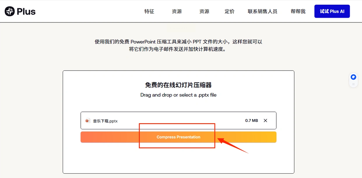 步骤二:上传完成后,界面会自动生成压缩方案。无需手动调节参数,AI会根据文件类型自动选择最优压缩策略——比如纯文字PPT优先压缩字体包,图片多的PPT则优化图片格式。