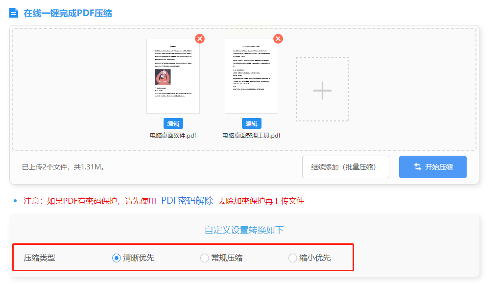 5. 上传后,一般直接点“开始压缩”就可以了。有些可能会提供简单的清晰度选项。