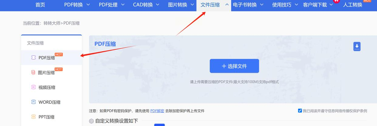 打开网页后,在首页找到"文件压缩"→"PDF压缩"选项,进入专门的压缩页面。
