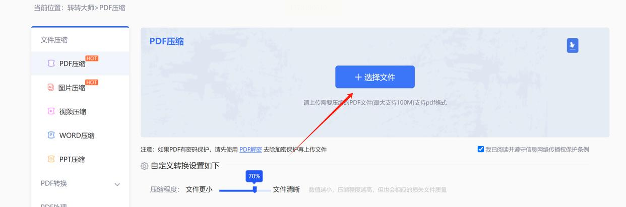 点击页面中央的"选择文件"按钮,在弹出的文件管理器中选中需要压缩的PDF文件。若需批量上传,可先按Ctrl+A全选文件夹中所有PDF,再点击"打开"。上传过程中系统会显示进度,若文件超过100MB,可能需要分批次处理。