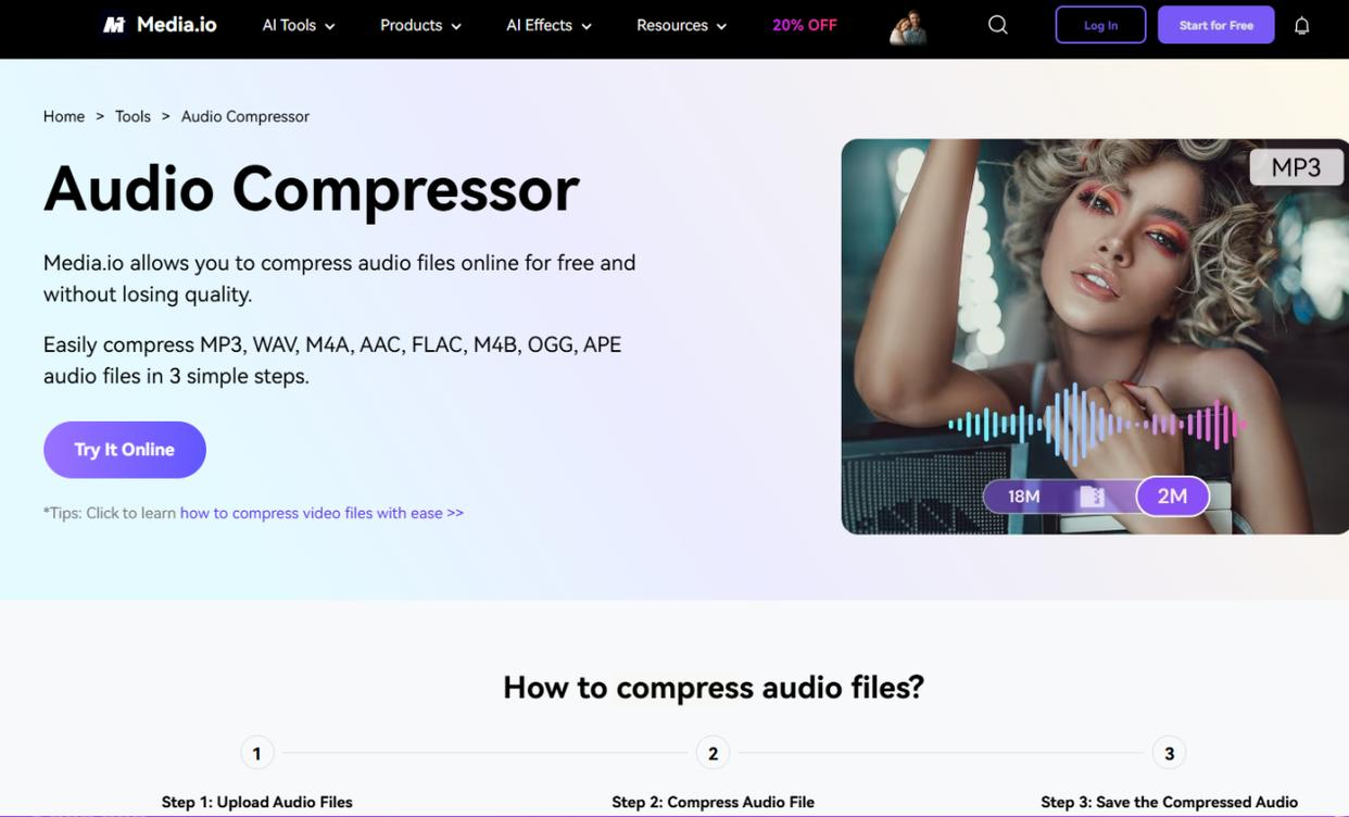 Media.io提供一站式的音频处理服务,集压缩、格式转换和剪辑功能于一身。比如,你可以从视频中提取背景音乐,压缩后插入演示文档。它采用先进的压缩算法,能在保证音质的前提下有效减小文件体积,音质损失控制在很低的范围内。这个工具支持跨平台使用,在手机、电脑和平板上都能操作,压缩记录还会同步到云端,方便用户在不同设备间切换工作。