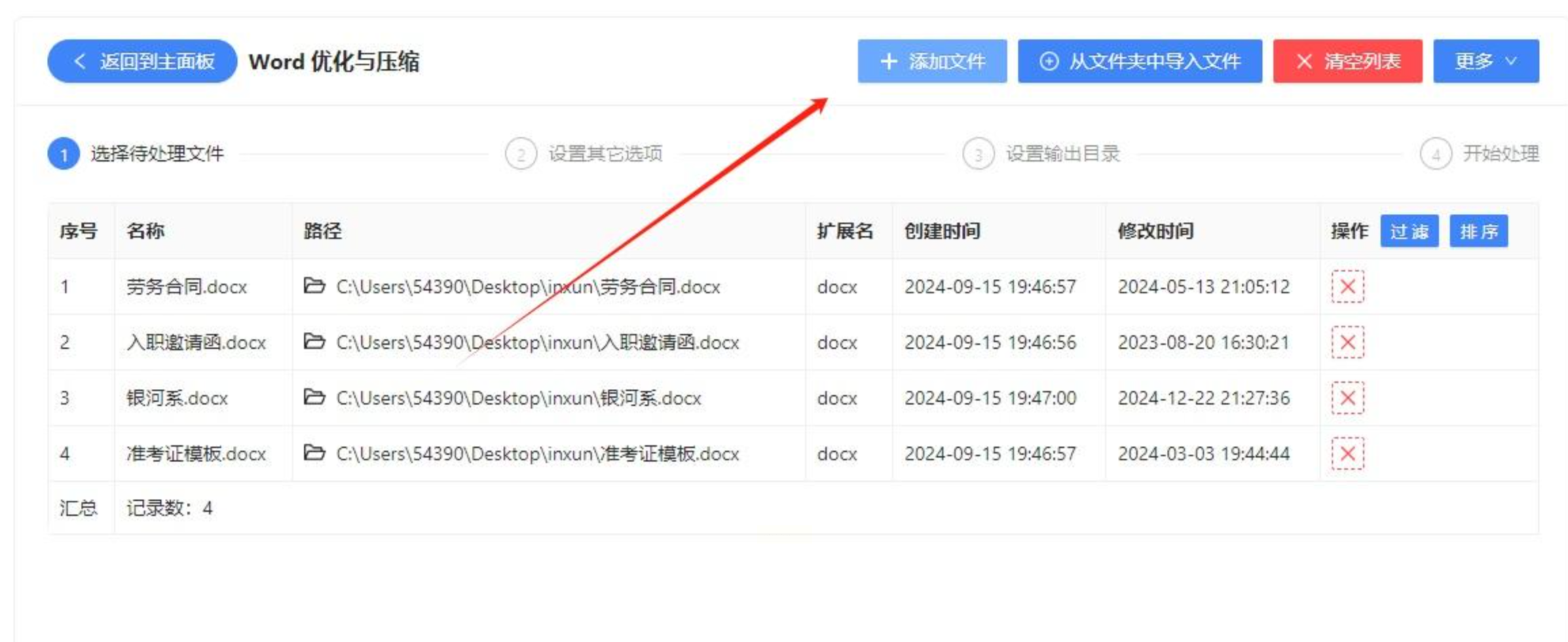 步骤二:通过【添加文件】或批量导入方式加载需要优化的文档,支持同时处理数十个文件。