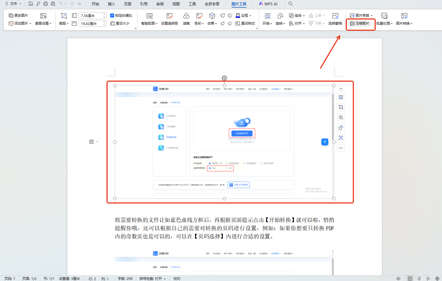 步骤一:在WPS中打开目标Word文档,选中任意一张需要处理的图片。