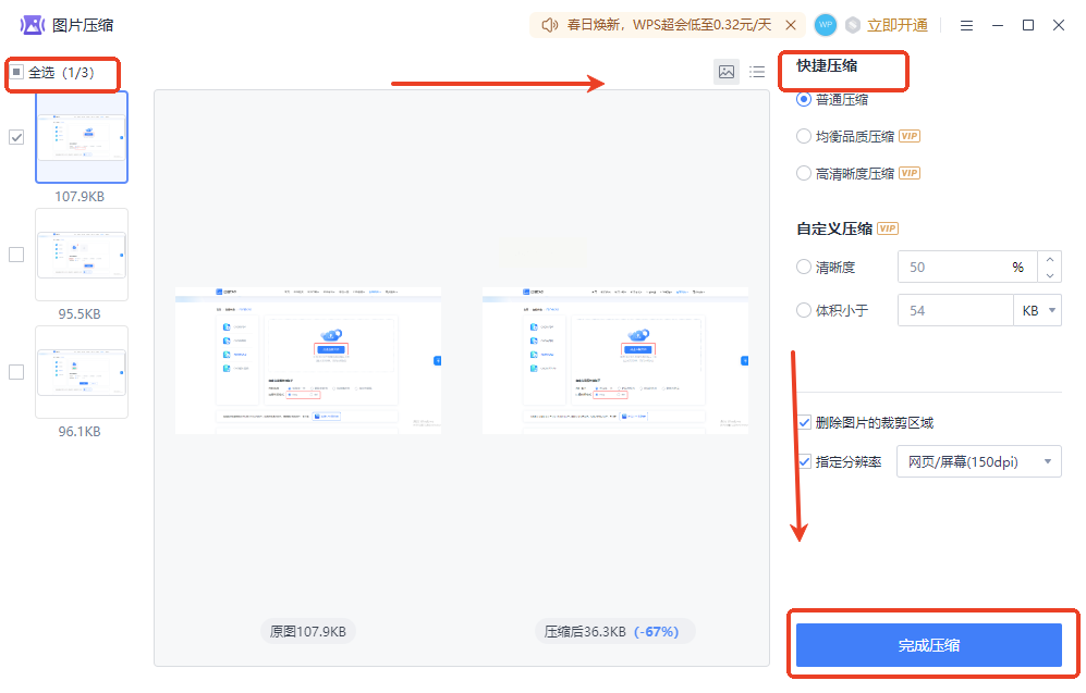 步骤五:确认设置后点击【完成压缩】,保存文档即可查看体积变化。此方法通过降低图像冗余数据来缩小整体文件,但不会影响文字内容。