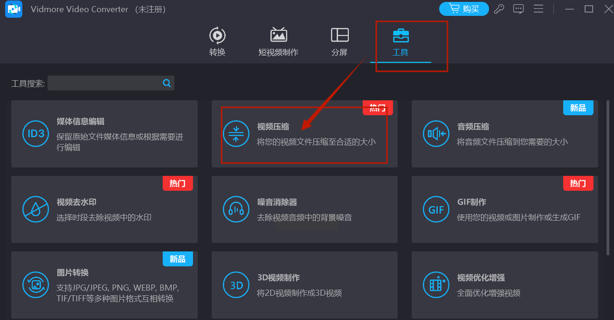 启动Vidmore Video Converter后,在主界面找到“工具”选项,点击进入。在工具列表中,选择“视频压缩”功能。