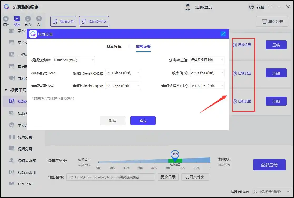 步骤三:在弹出的设置窗口里,你可以直接拖动一个“压缩强度”的滑块进行快速设置。如果想更精细,就进入“高级设置”,手动调整分辨率、比特率、帧率等数值。