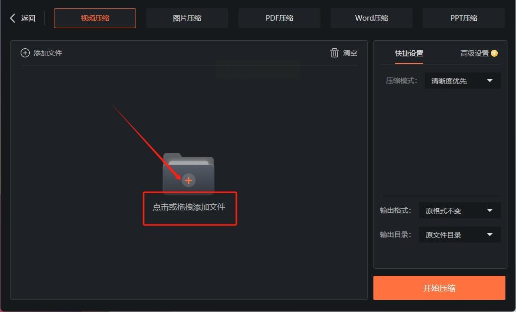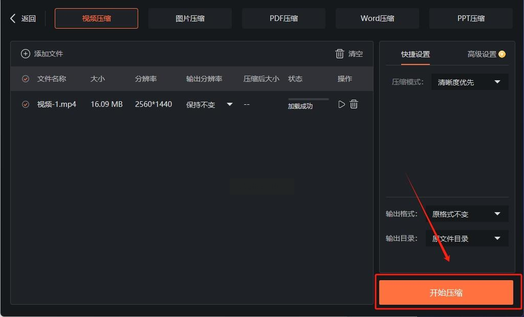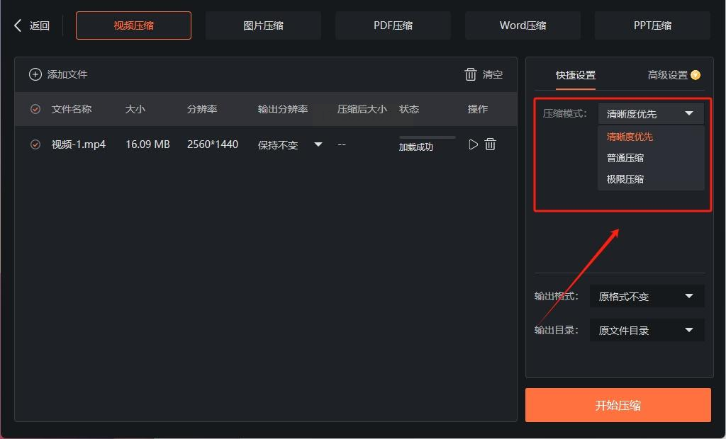 3. 智能压缩:选择“快速压缩”或“高清优先”模式。快速压缩模式下,软件会自动优化参数,适合紧急场景;高清模式保留更多细节但压缩效果稍弱。
