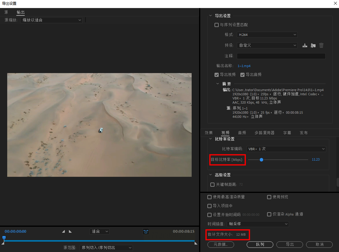 - “比特率”设为800-1500Kbps(根据原视频大小调整)