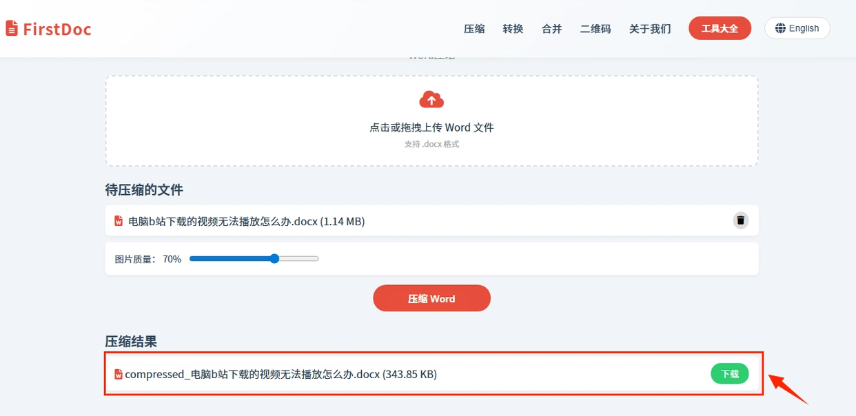 调整好之后,点击“压缩 Word”按钮。网站处理完成后,页面会直接显示压缩结果,比如压缩前后的文件大小对比,让你一目了然。最后,在旁边找到一个下载按钮(通常是绿色的),点击它,就能把压缩好的文档保存到本地了。
