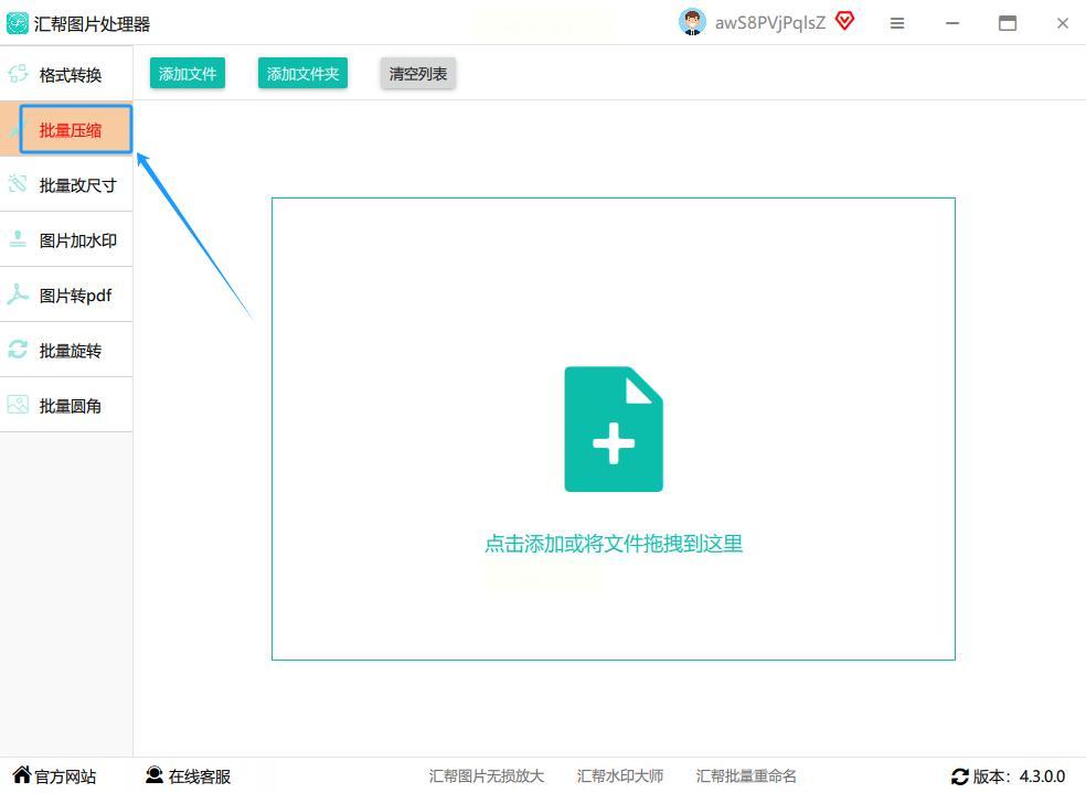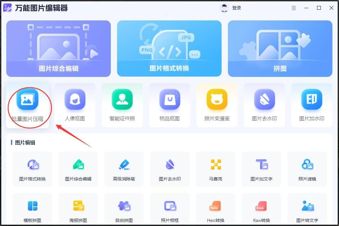 首先打开软件。打开后界面会很干净,一眼就能看到“批量压缩”这几个大字,点进去就对了!