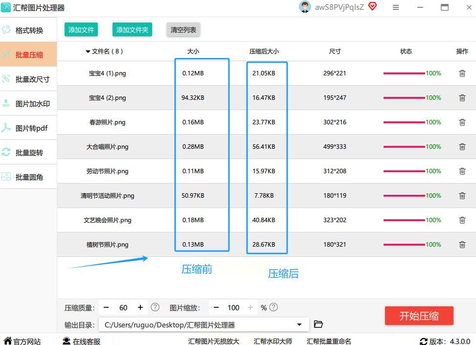 全部设置好之后,同样是点击“开始压缩”。等它处理完,去输出文件夹查看就行。这个方法给了你更多的控制权,适合对图片参数有具体要求的场景。