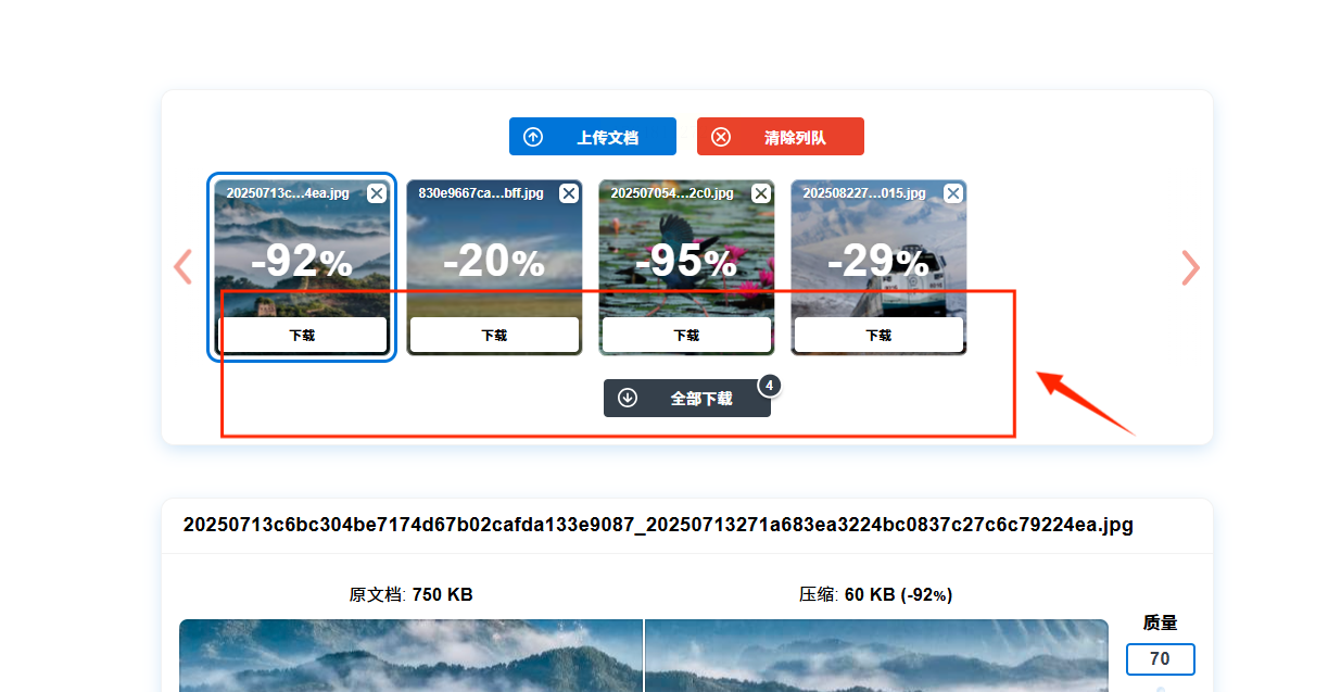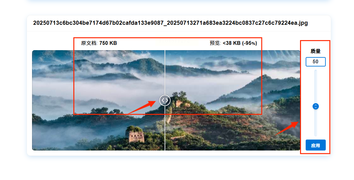 上传完成后,每张图片下面或旁边,通常会有一个滑块。拖动这个滑块,就能实时调整压缩质量。你一边拖,它一边会显示压缩后的预估大小,非常直观。你可以根据这个大小提示,来决定压到什么程度。