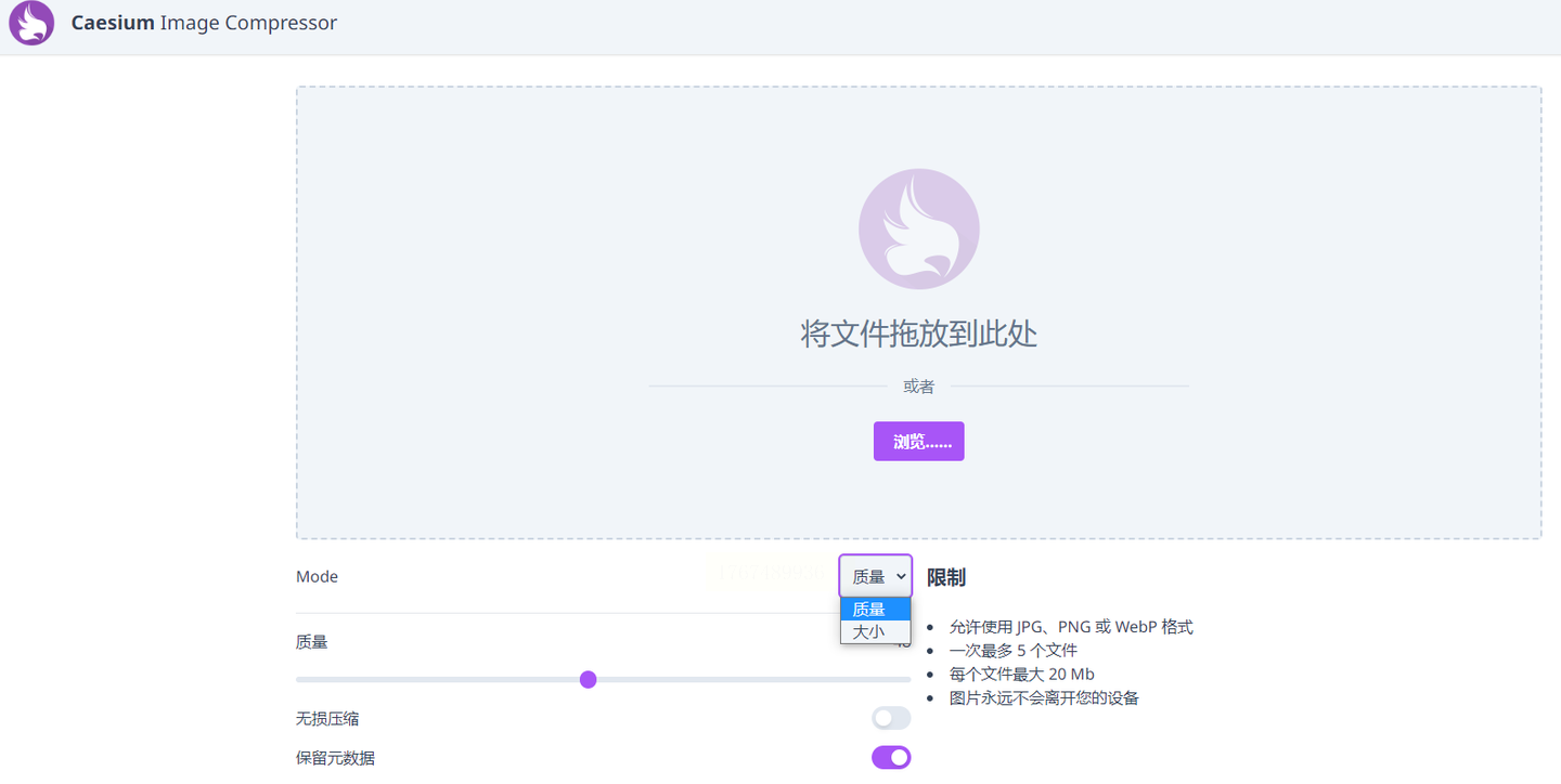 1. 功能界面:打开官网后,界面仅保留“上传图片”和“压缩参数”两个核心操作区,设计极简。