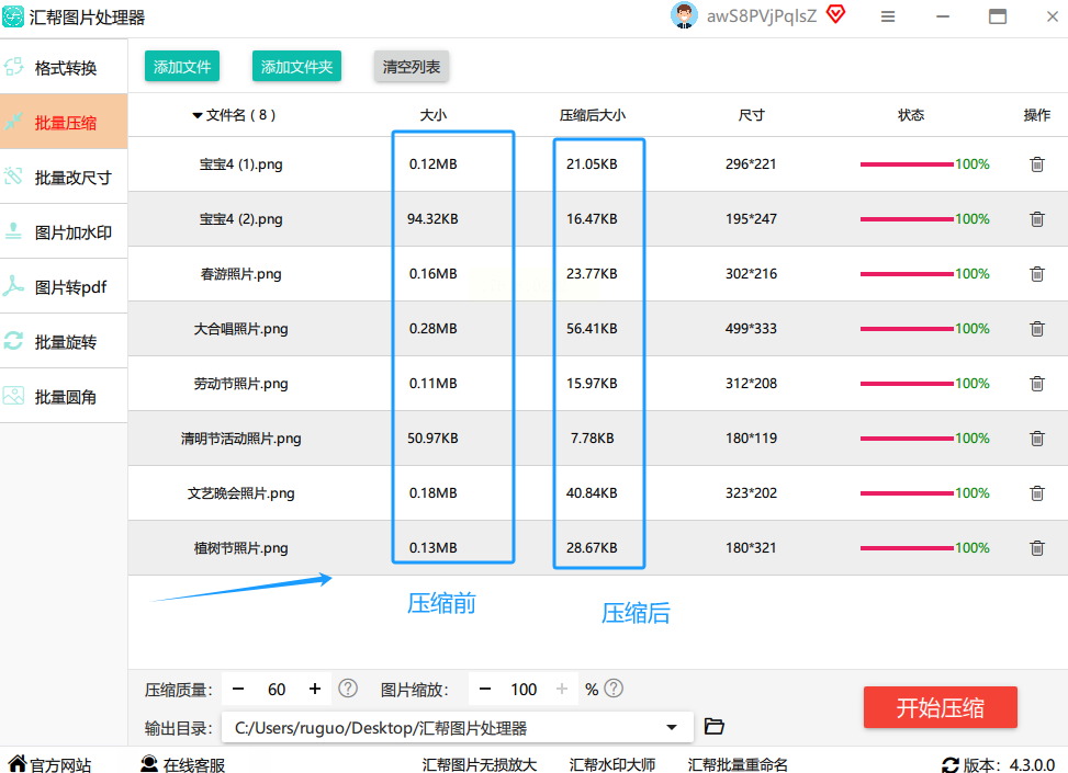 4. 设置好输出文件夹,点击“开始压缩”或“执行批处理”。等待完成即可。