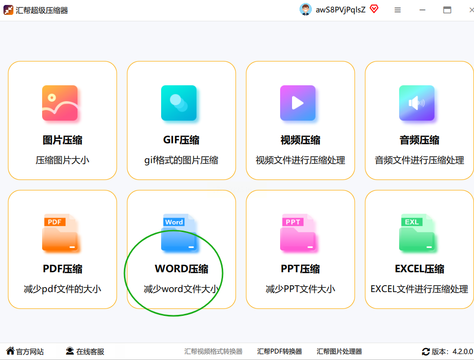先打开汇帮超级压缩器,主界面一眼就能看到"WORD压缩"这个选项,点进去就对了。界面很干净,没有乱七八糟的广告,操作起来特别直观。