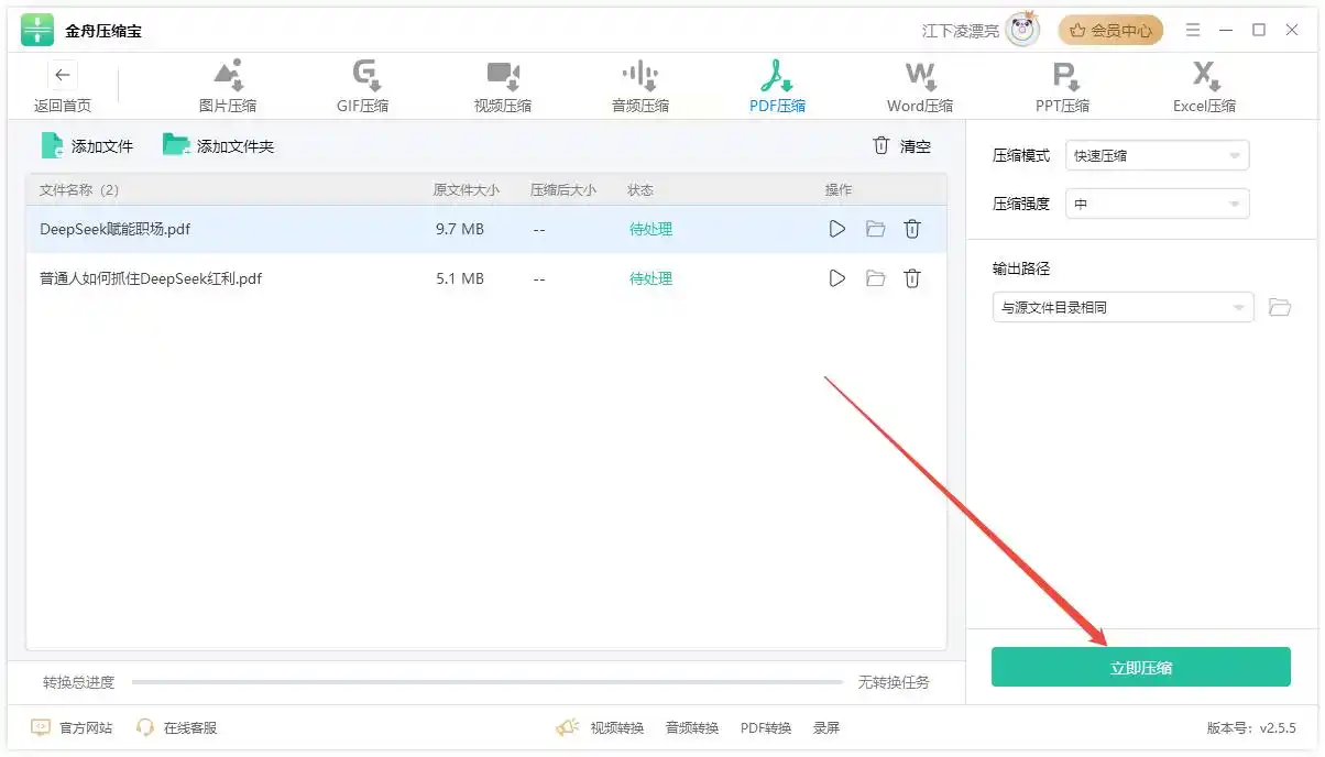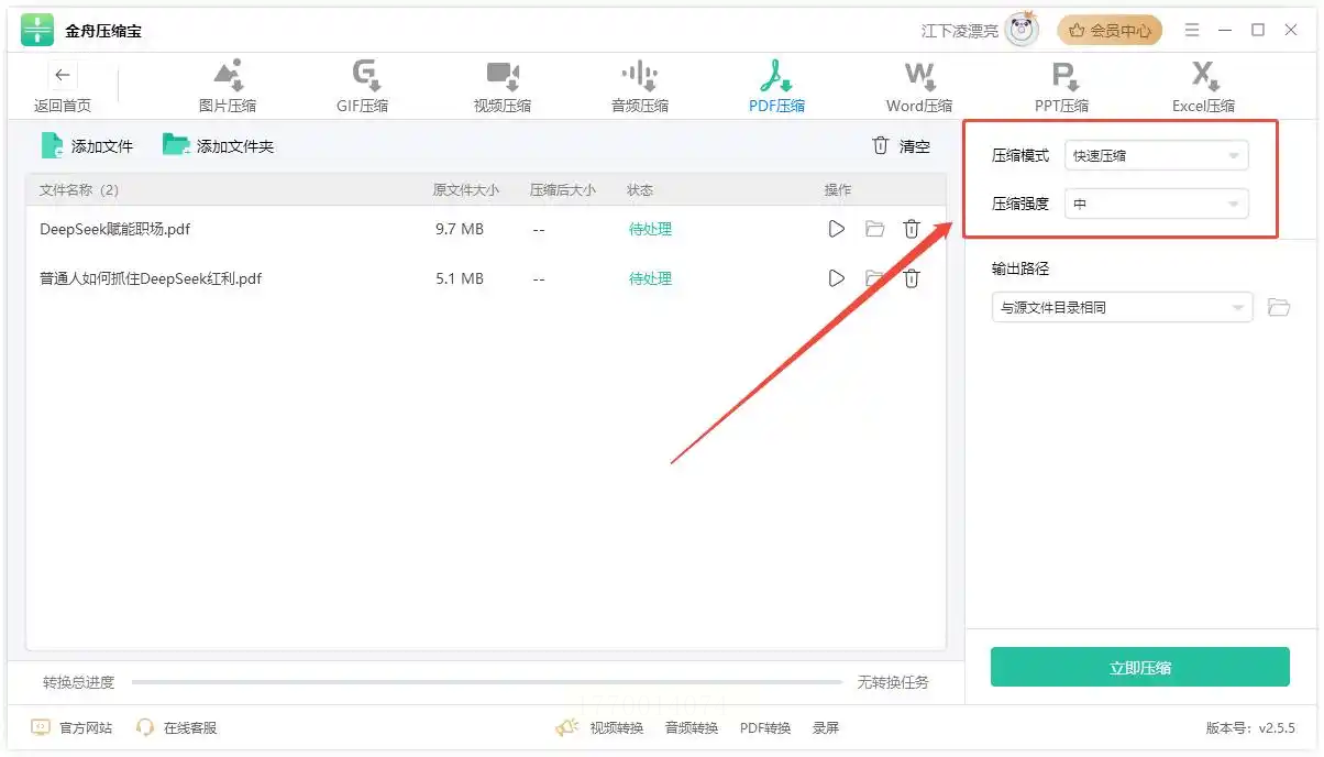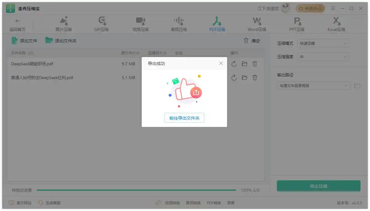 金舟压缩宝是一款专注于文档处理的工具,其PDF压缩功能简单直观,适合对压缩质量有一定要求的场景。