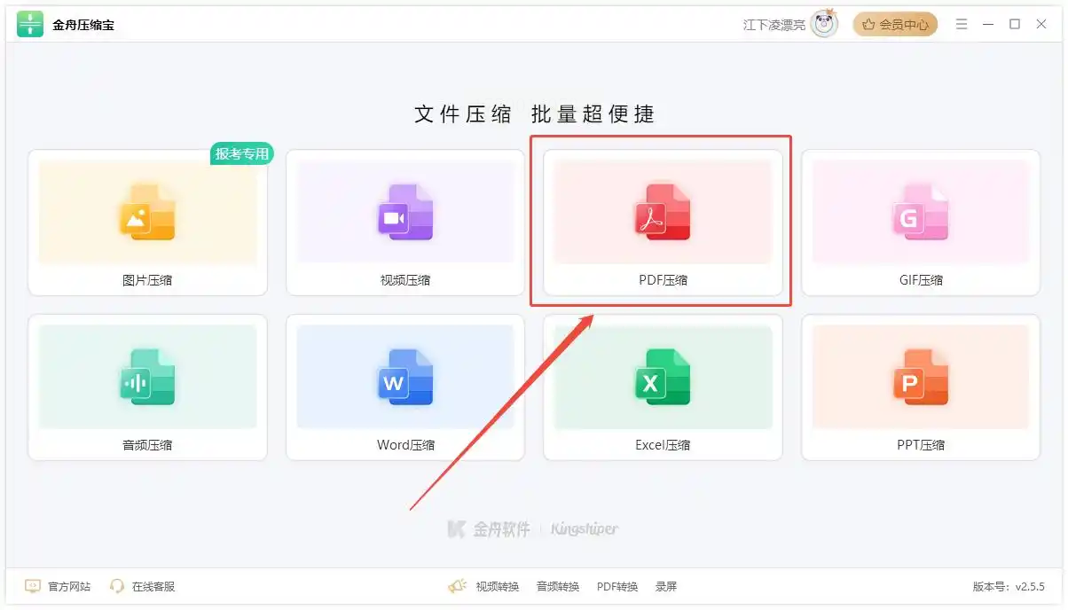 1. 打开软件,选择功能:电脑端运行金舟压缩宝,在主界面中找到并点击“PDF压缩”选项。