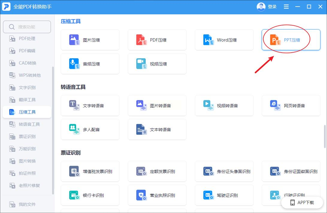 步骤一:在电脑上打开全能PDF转换助手软件,在主界面中找到“压缩工具”选项,然后点击“PPT压缩”功能。