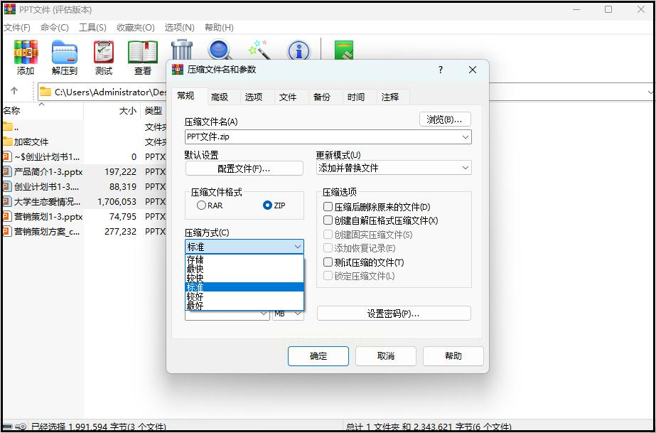 步骤三:在弹出的设置窗口中,选择压缩格式(如ZIP或RAR)、压缩方式(如“标准”或“最好”),并设置压缩包名称和保存路径。点击“确定”开始压缩。