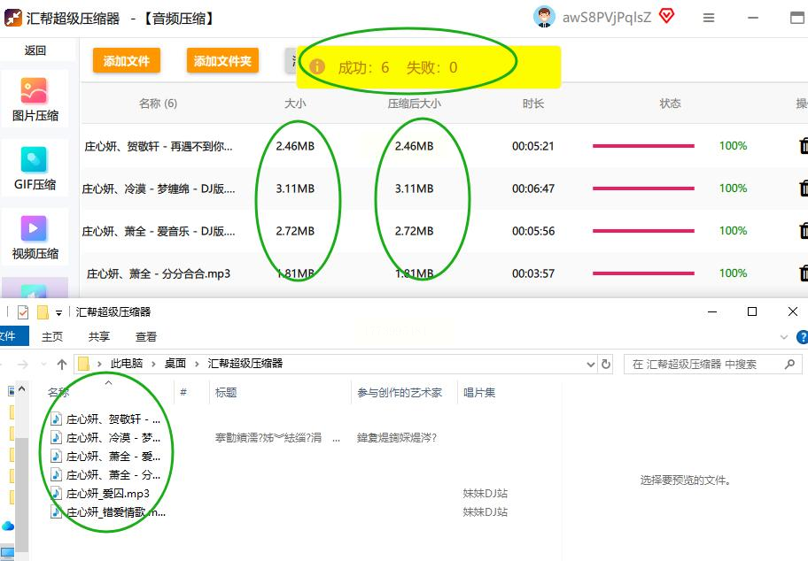 点击「一键压缩」,软件自动处理所有文件,进度条显示每首歌曲的压缩进度,
