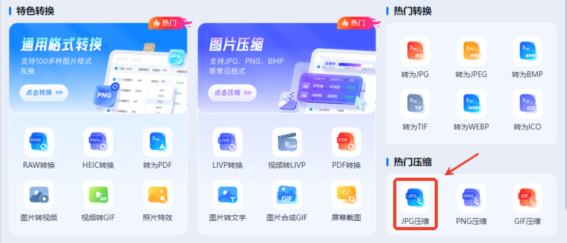 * 在网站首页,你会看到很多图片处理工具的图标,找到并点击 【压缩JPG】 或 【压缩图像】 这个选项。