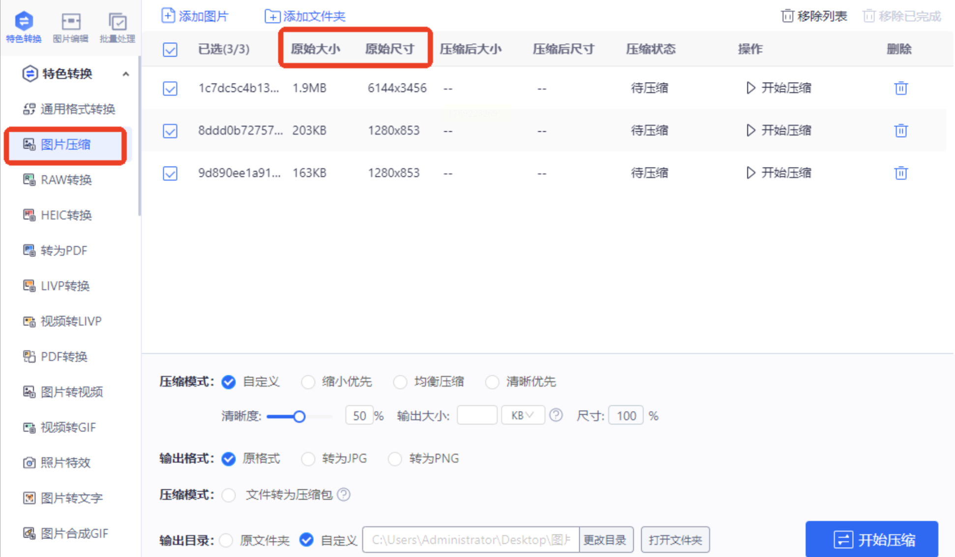 * 进入操作页面后,点击 【添加图片】 或直接将图片拖入。软件会清晰列出每张图片的名称、原始大小和尺寸,一目了然。