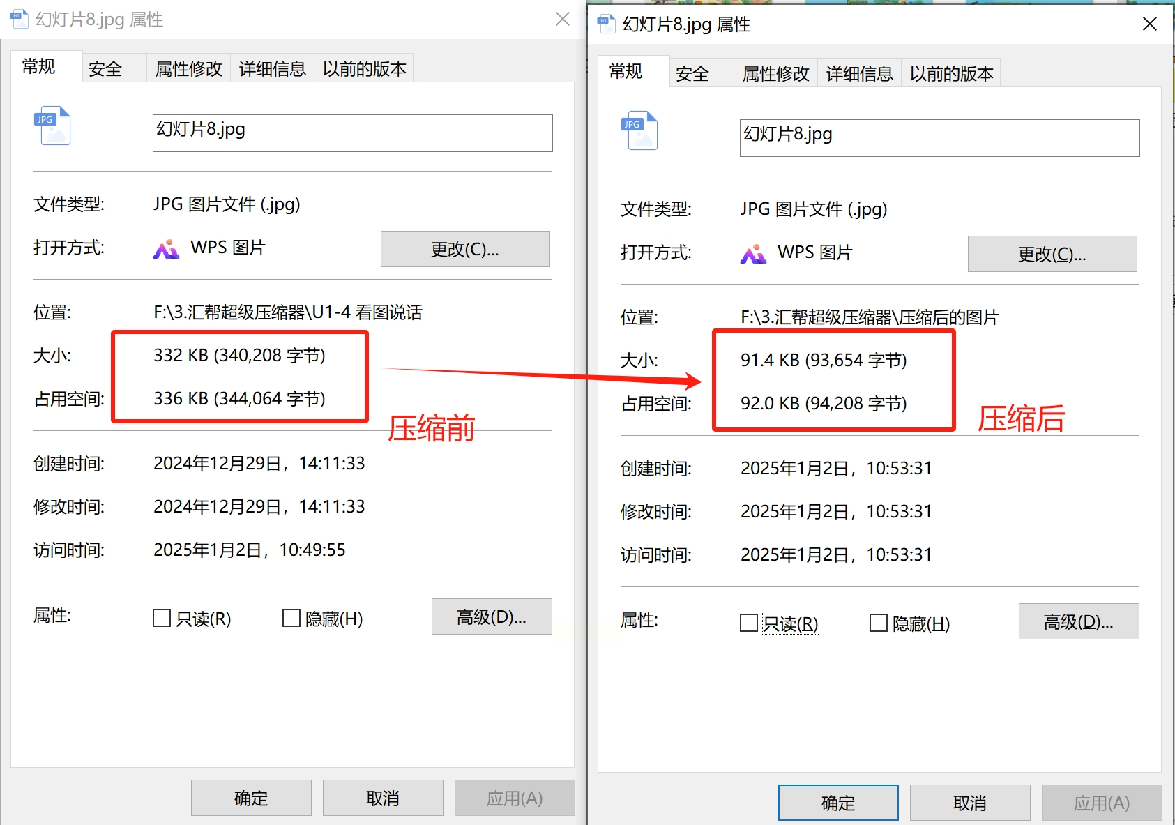 此时我们可以查看一下原图和压缩图的属性,看看文件大小缩小了多少,同时打开图片看看清晰度是否满意。如果不满意,可以调整第4步的质量参数,再压缩一次。
