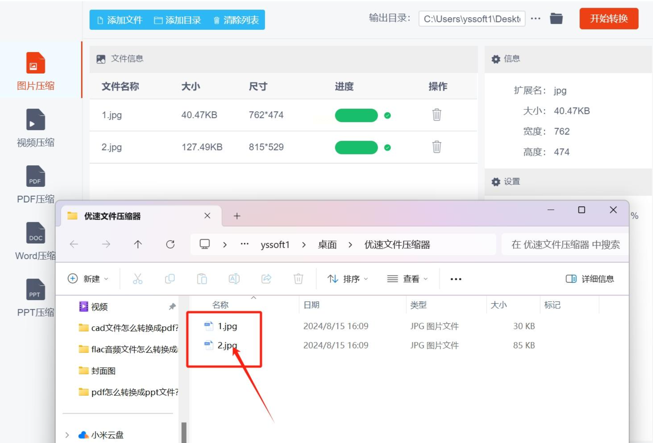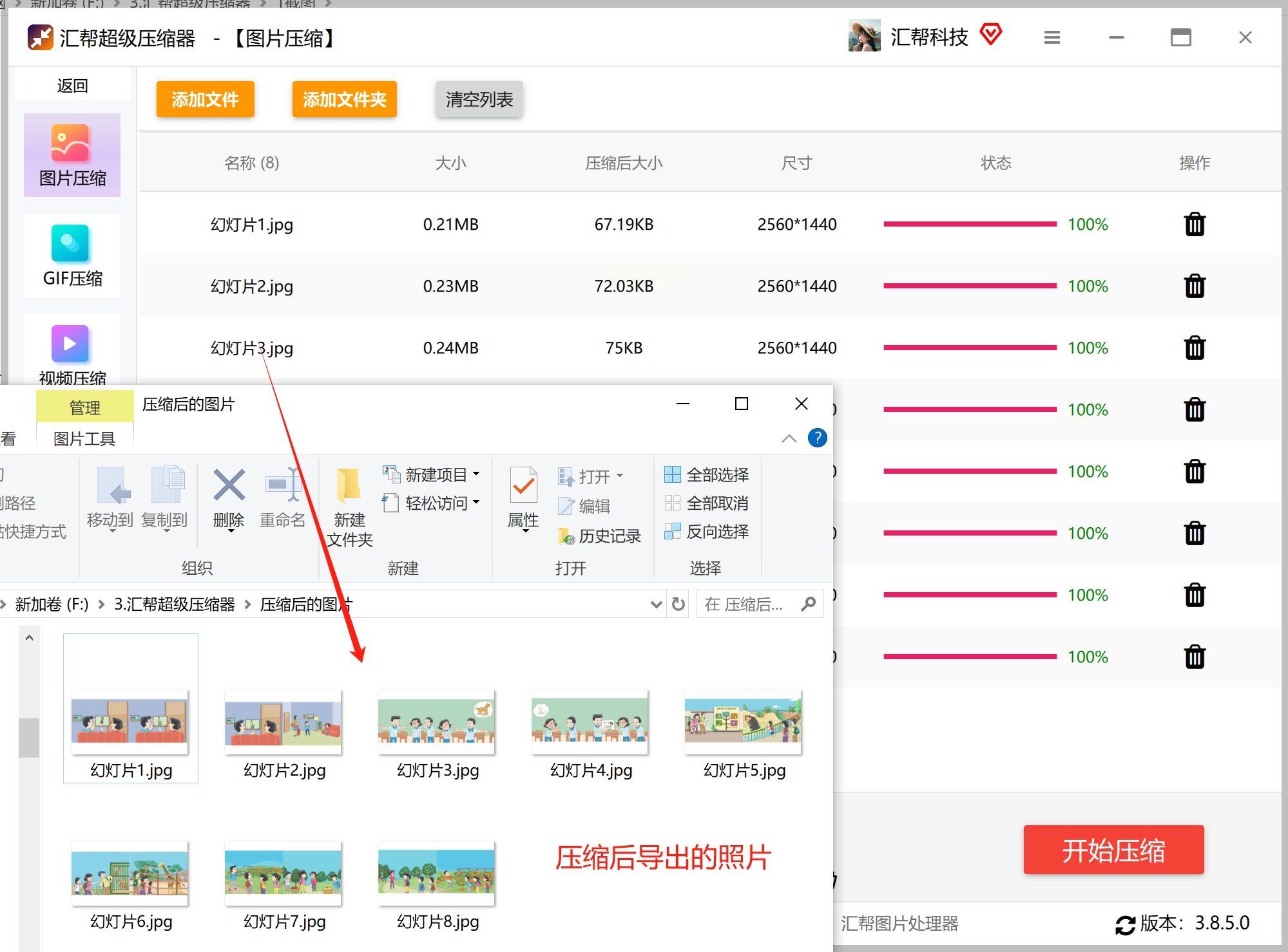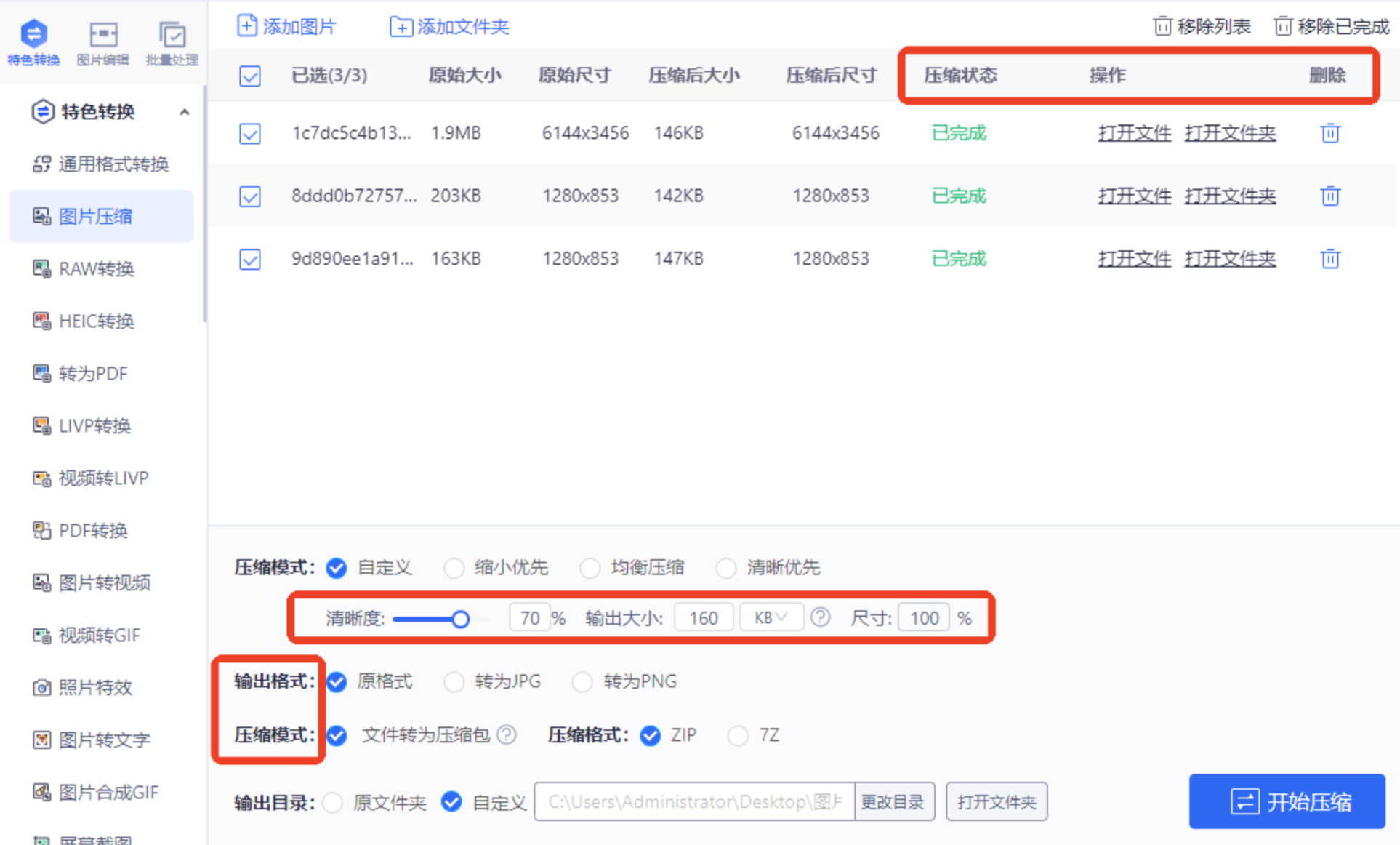 * 压缩结束后,软件通常会弹窗提示,并自动打开输出文件夹(或者你可以手动点击“打开输出文件夹”)。里面就是你压缩好的、体积变小的新图片了。