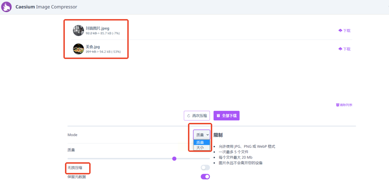4. 对比预览功能:压缩前可点击"原图"与"压缩后"切换查看,右侧会显示具体数值(如原始大小1.2MB,压缩后380KB,压缩率70%),帮助判断是否达到预期效果。