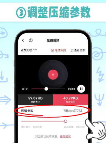 和电脑软件类似,你要选输出格式(MP3最稳妥),然后有个压缩强度的滑块。往左拉文件更小但音质差些,往右拉音质更好但文件更大。建议先放中间位置试一次。
