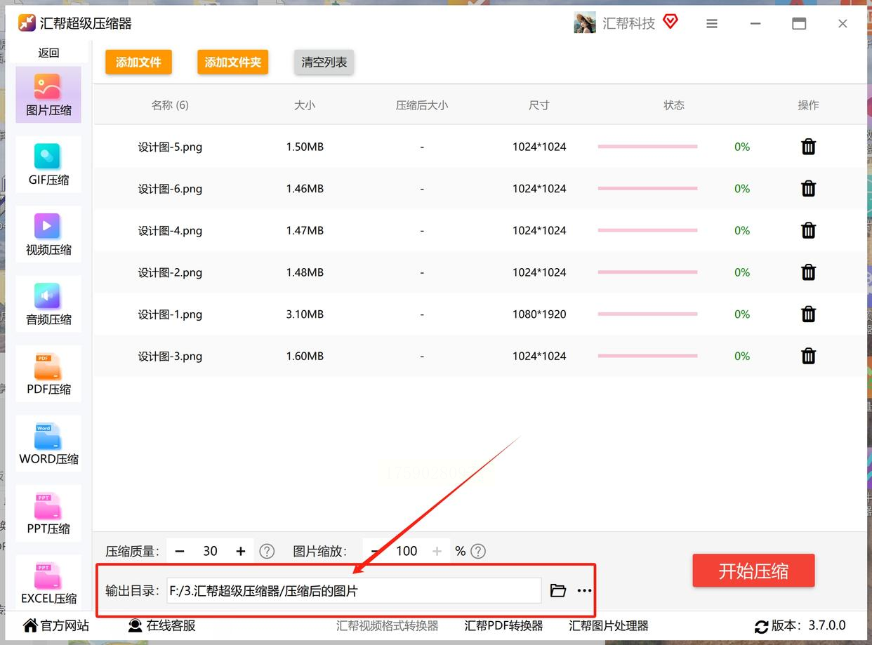 4. 设置输出文件夹,然后点击“开始”按钮执行批量压缩。完成后在输出目录查看结果,专业工具的控制精度通常更高。