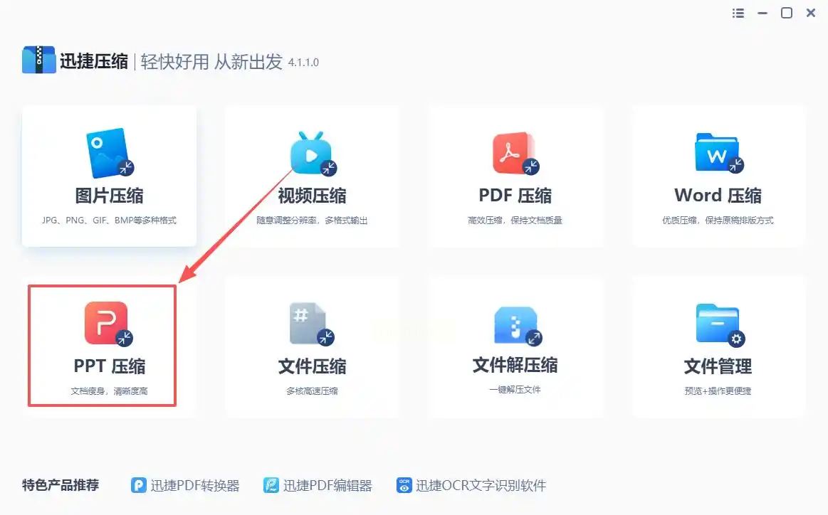 1. 打开迅捷压缩官网,在功能区点击「PPT压缩」