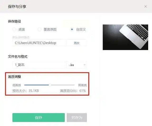 步骤三:这时会弹出一个保存设置窗口。在窗口里,你会看到一个“画质”或“图片质量”的滑动条。向左拖动这个滑块,降低画质百分比,下方显示的预估文件大小也会随之减小。调整到你满意的大小后,点击保存即可。