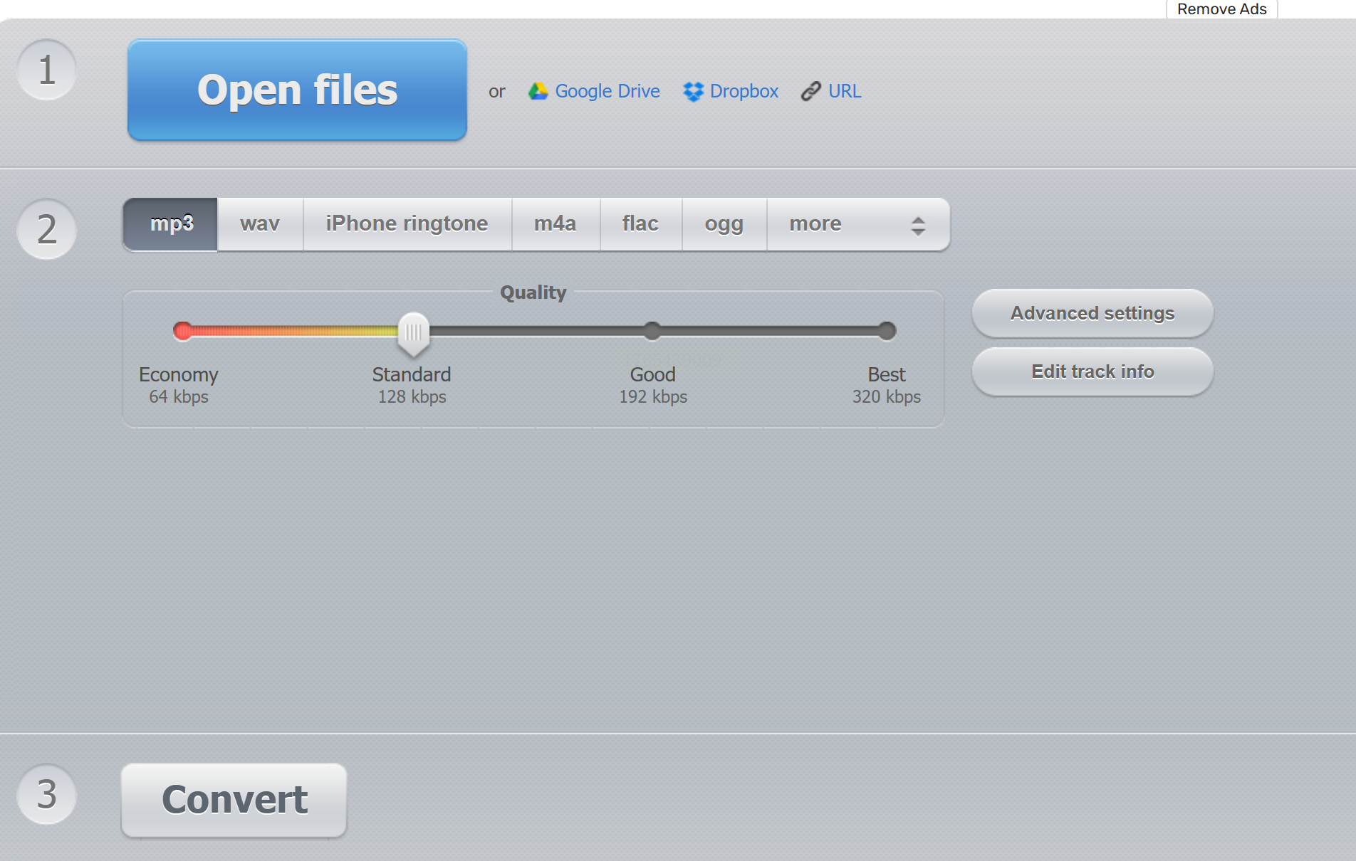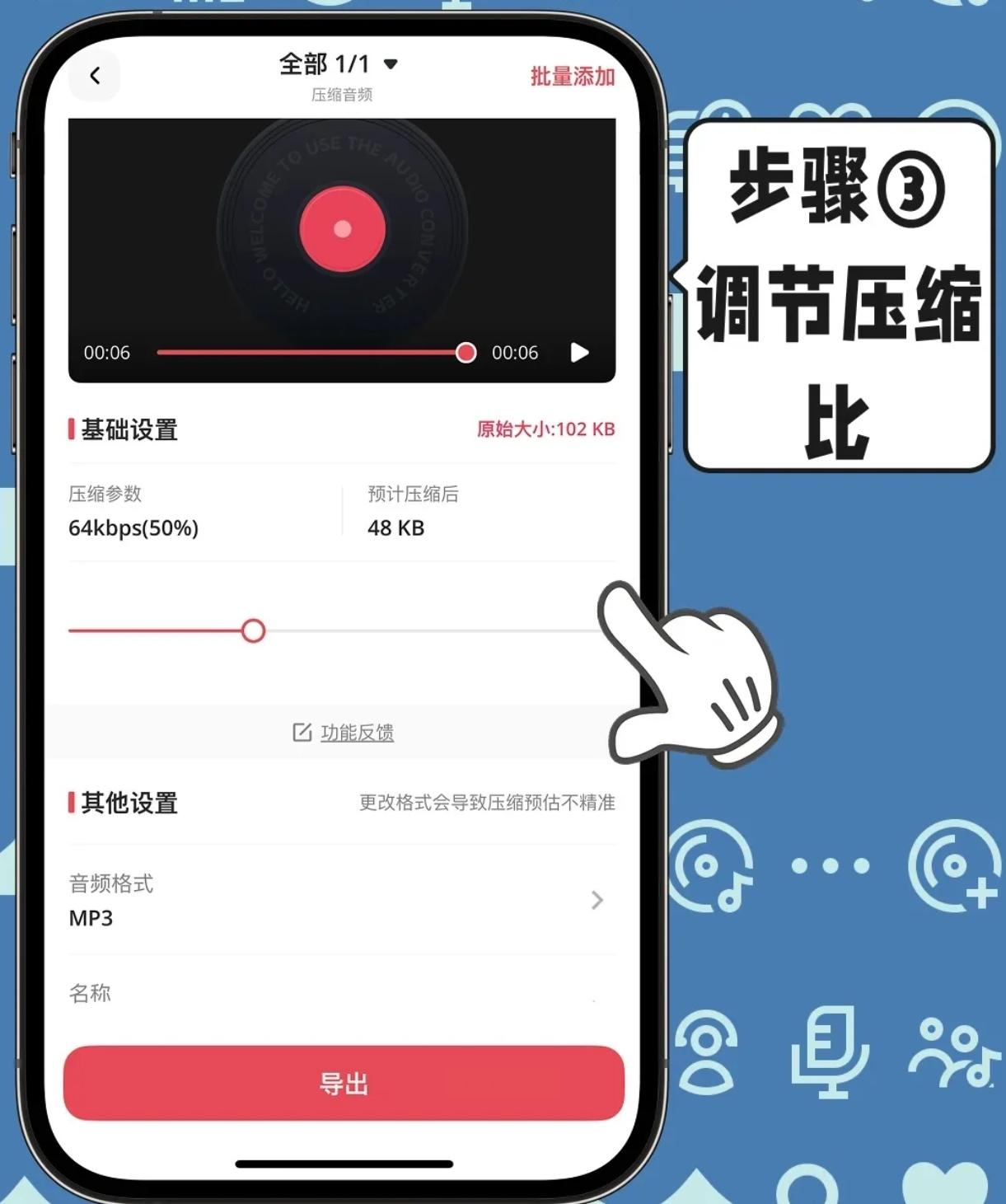 - 比特率调节:从下拉菜单选择比特率(64kbps-320kbps),压缩选择64-128kbps,平衡音质与体积