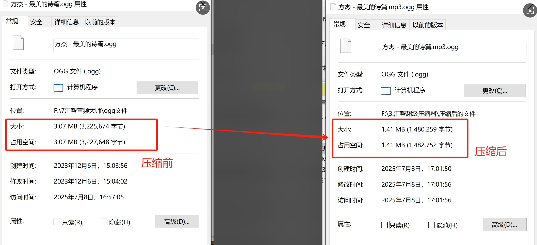 指定输出目录(建议单独建立"压缩后音频"文件夹便于管理),点击"开始压缩",状态栏显示实时压缩速度(约10MB/秒)。完成后在目标文件夹查看压缩后的OGG文件,右键查看属性可对比体积变化。