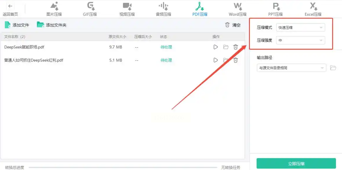 1. 指定大小压缩:点击【PDF压缩】后,直接在右侧输入框设置目标大小(如2048KB),软件会自动计算压缩比例。