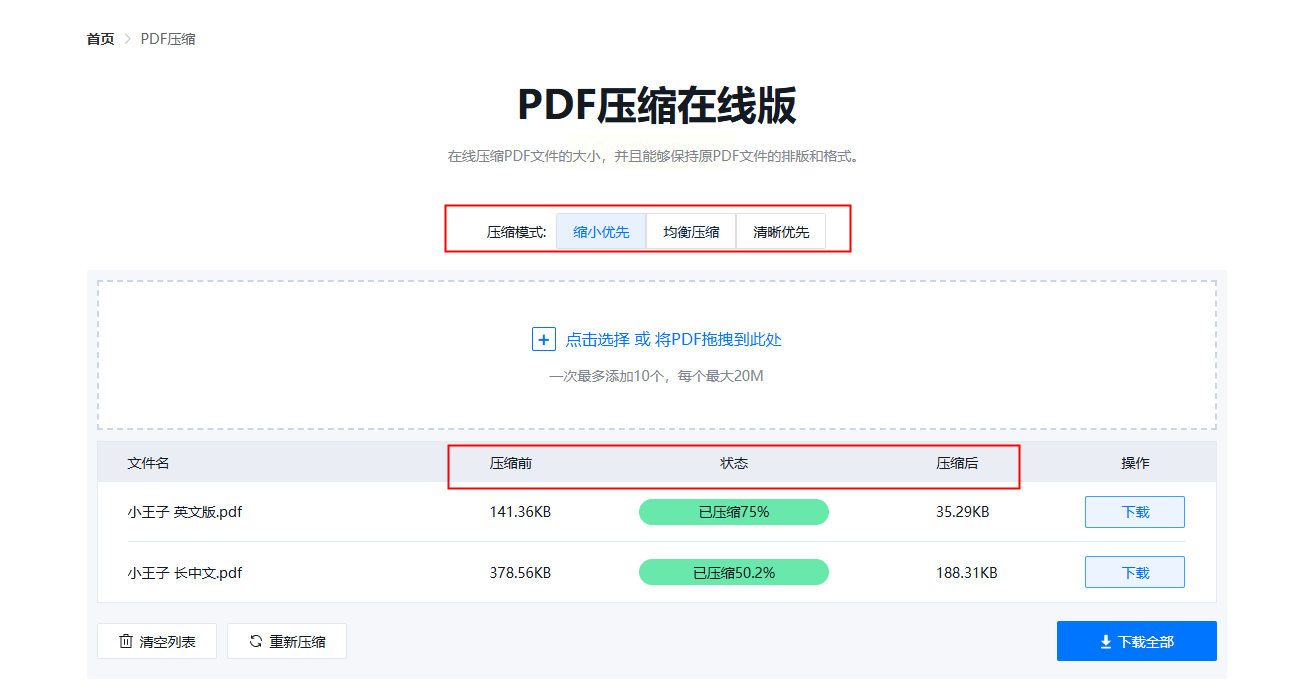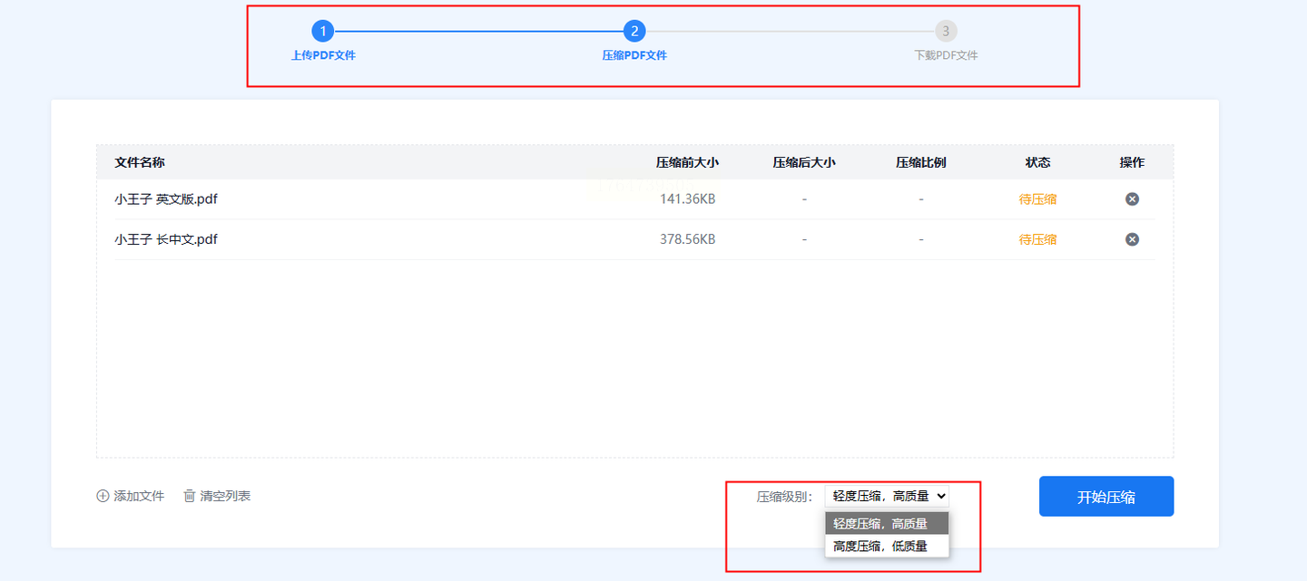 2. 批量上传文件:点击"选择文件"后,能同时选中10个PDF,进度条会显示每个文件的压缩状态。