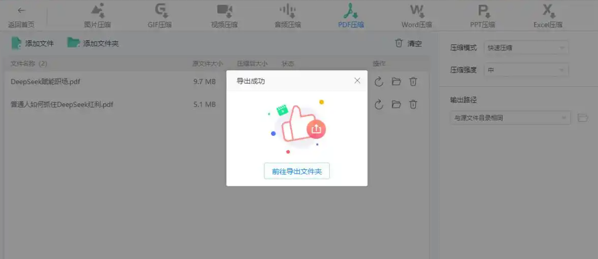 3. 压缩参数设置:软件提供"最小压缩"、"画质优先"和"极致压缩"3种模式。默认的"画质优先"适合大多数场景,若需极小体积可选"极致压缩",但要注意含高分辨率图片的PDF压缩过度会模糊。