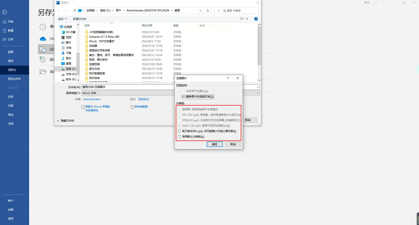系统会弹出一个压缩设置窗口。您可以根据用途选择不同的分辨率(例如,用于网页或电子邮件通常可以选择较低分辨率)。同时,可以勾选“删除图片的剪裁区域”选项以进一步减小体积。点击“确定”应用设置。