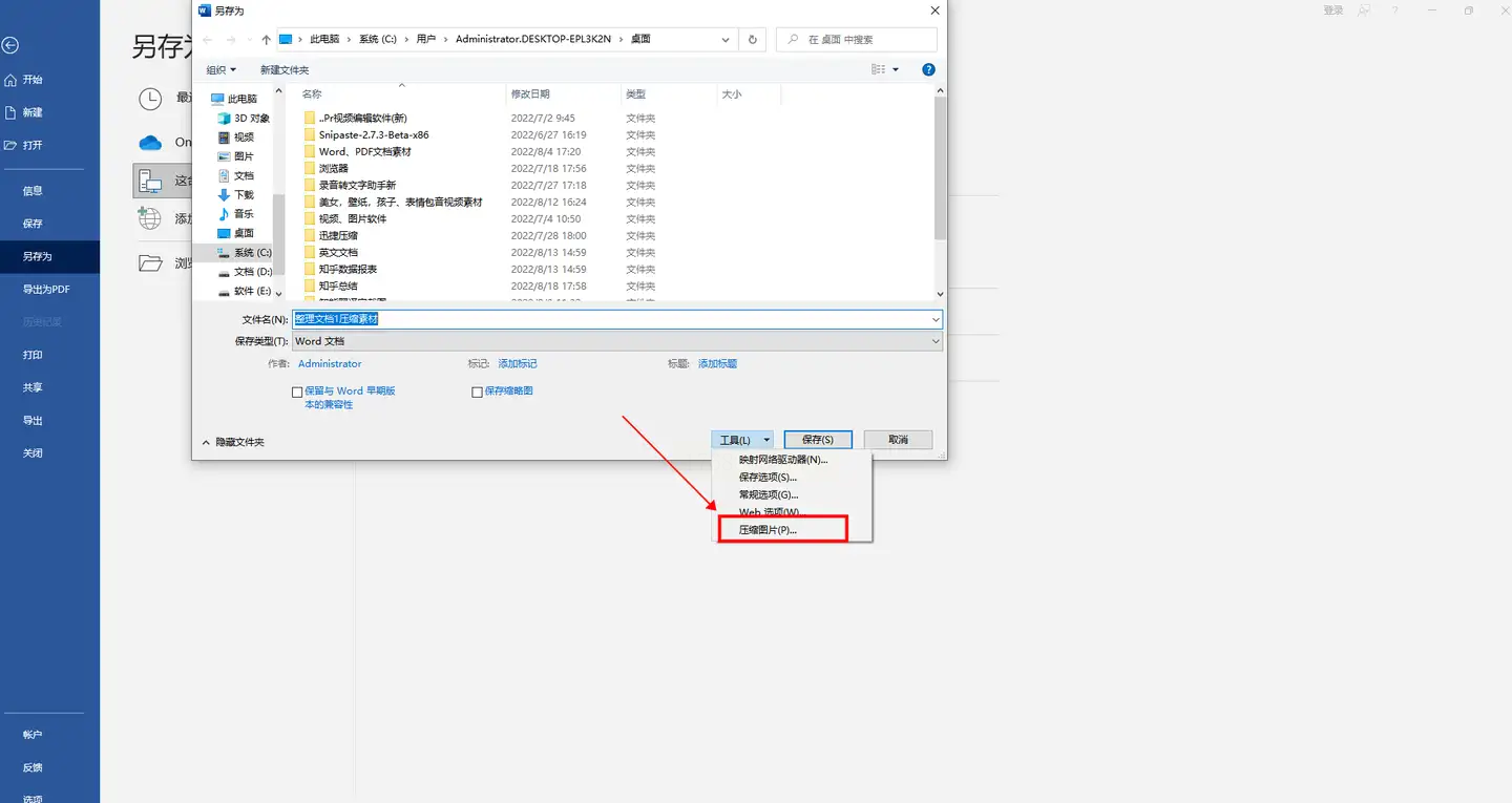在“另存为”对话框的底部,找到并点击“工具”按钮(通常在“保存”按钮旁边),在弹出的菜单中选择“压缩图片”选项。