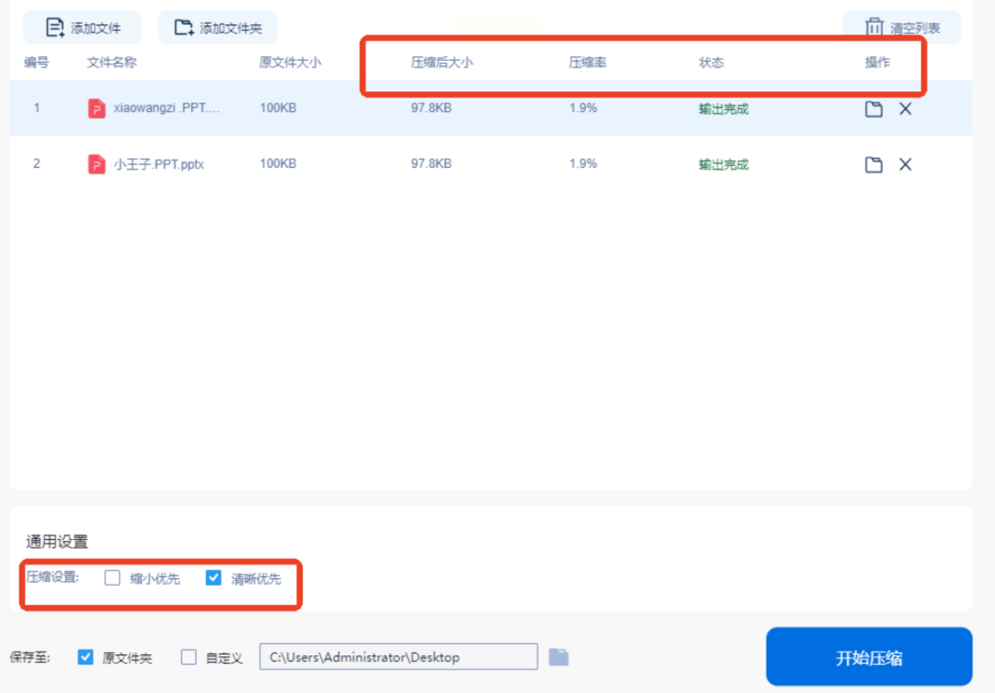 步骤四:点击右下角的“开始压缩”按钮。稍等片刻,当文件状态变为“输出完成”时,压缩就结束了。软件会很贴心地显示压缩后的大小和压缩比率,让你对效果一目了然。
