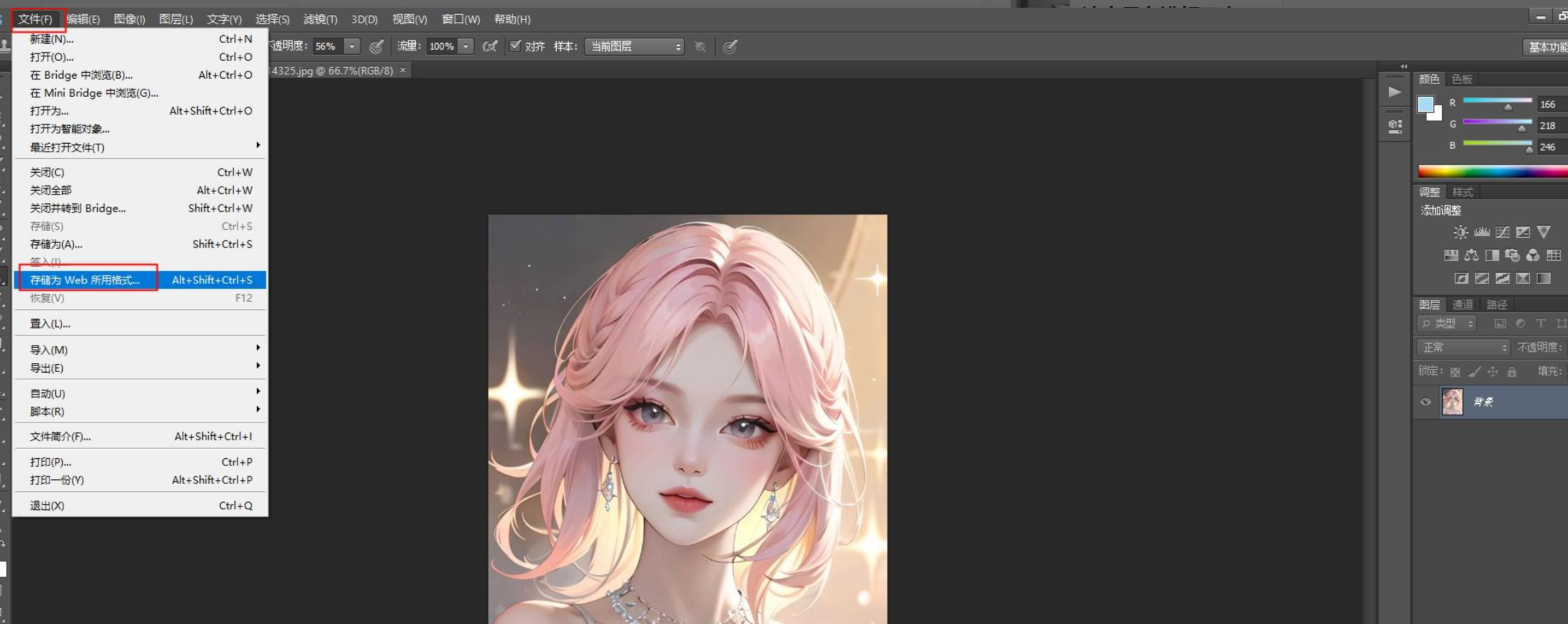 这是PS中专门为网络用途优化的保存功能。点击【文件】菜单,选择【导出】或【存储为】,然后找到【存储为Web所用格式(旧版)】选项。