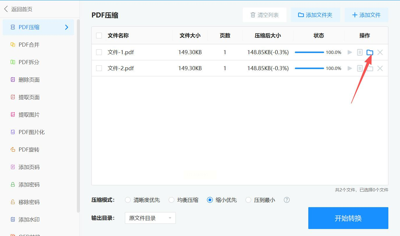 点击“开始转换”,软件会显示每个文件的压缩进度。完成后,可在“已完成”列表中查看结果,点击“打开文件夹”定位压缩后的文件。