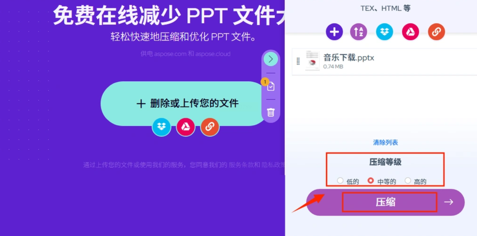 1. 选择【PPT压缩】模块,支持“普通压缩”(平衡画质)、“清晰度优先”(保留更多细节)、“极限压缩”(适合纯文本PPT)