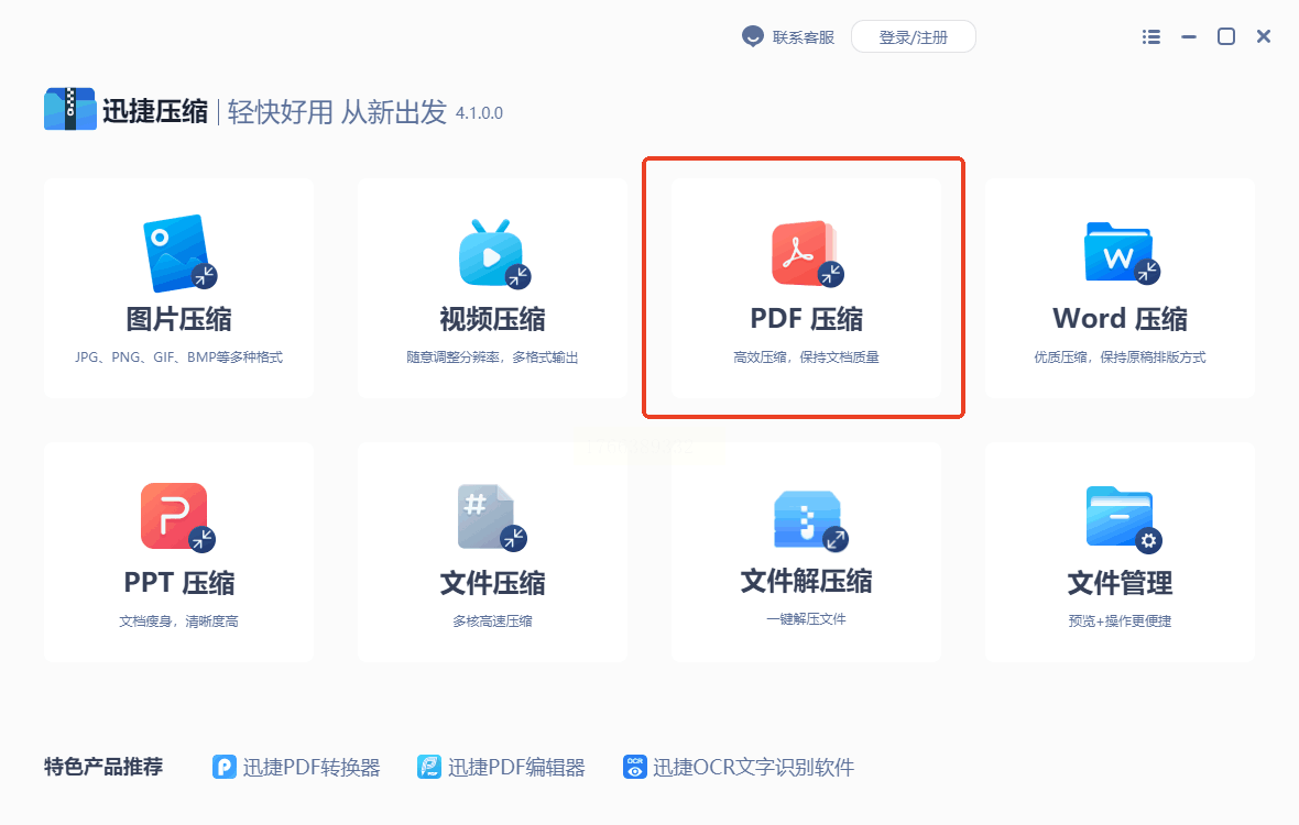 步骤一:在计算机上安装并运行。在主界面,清晰找到并点击“PDF压缩”功能选项。该软件通常将不同格式的压缩功能明确分类,方便快速定位。
