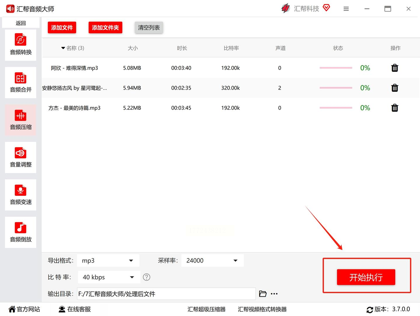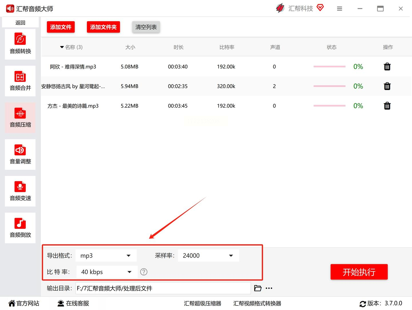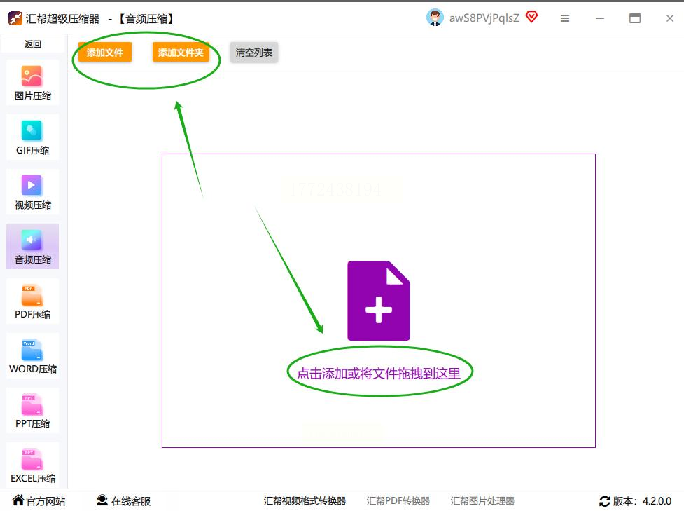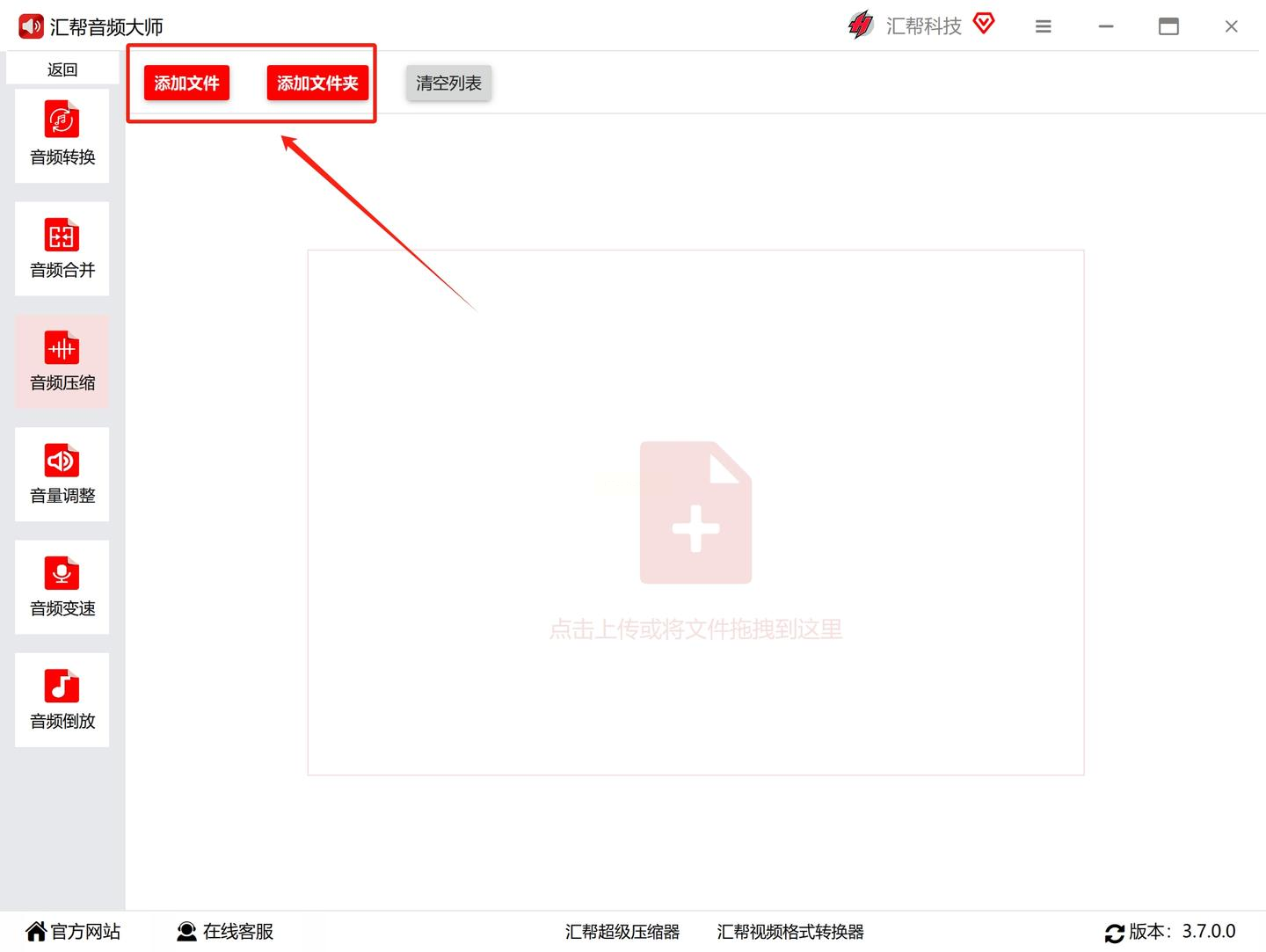 2. 批量导入文件:点「添加文件夹」,把你要压缩的音频文件全拖进去(文件夹直接拖最方便)。