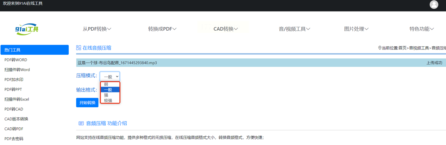 1. 打开网站:百度搜「91ai工具」,首页点「音视频工具」→「音频压缩」(不用下载任何插件)。